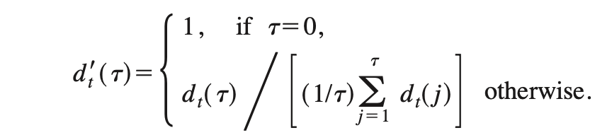 이 함수는 0이 아닌 1부터 시작하고, d(t)가 평균 이하로 떨어지는 경우에만 1 이하로 떨어짐.